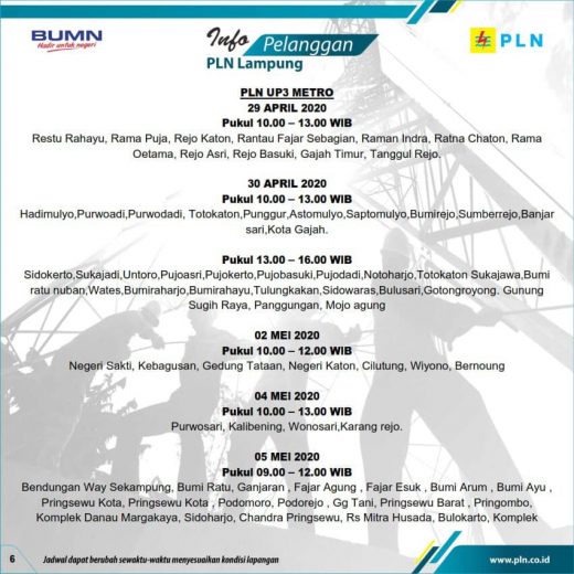 TERASLAMPUNG.COM — Perusahaan Listrik Negara (PLKN) Distribusi Lampung kembali akan melakukan bergilir pada Rabu, 29 April 2020 hingga 5 Mei 2020.