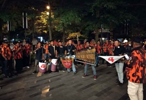 Tim pendukung pasangan nomor urut 4, Mustafa – Ahmad Jajuli tidak kalah heboh. Mereka menggunakan alat musik tradisional kulintang untuk memeriahkan suasana.