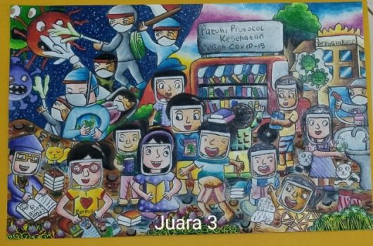 Pemenang pertama Karissa Atsila (SDN 1 Beringin Raya Bandarlampung) menggunakan krayon biasa. Namun, karyanya terlihat sekali imajinasinya bagaimana pentingnya buku untuk memahami dunia ini sekaligus upaya memerangi pandemi Covid-19.