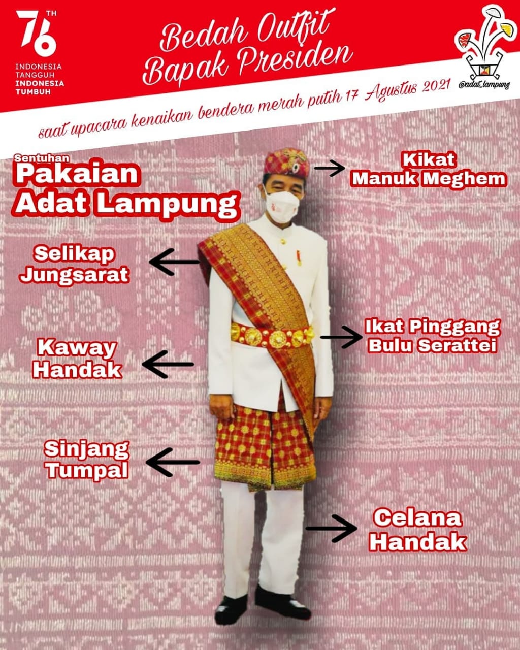 TERASLAMPUNG.COM — Sesaat setelah Presiden Joko Widodo (Jokowi) tampil mengenakan pakaian adat Lampung pada saat menjadi pemimpin upacara peringatan HUT ke-76 RI di Istana Negara, Selasa (17/8/2021), linimasa media sosial ramai aneka apresiasi dan kritikan. Banyak warganet di Lampung yang mengapresiasi langkah Jokowi memakai pakaian adat Lampung tersebut.