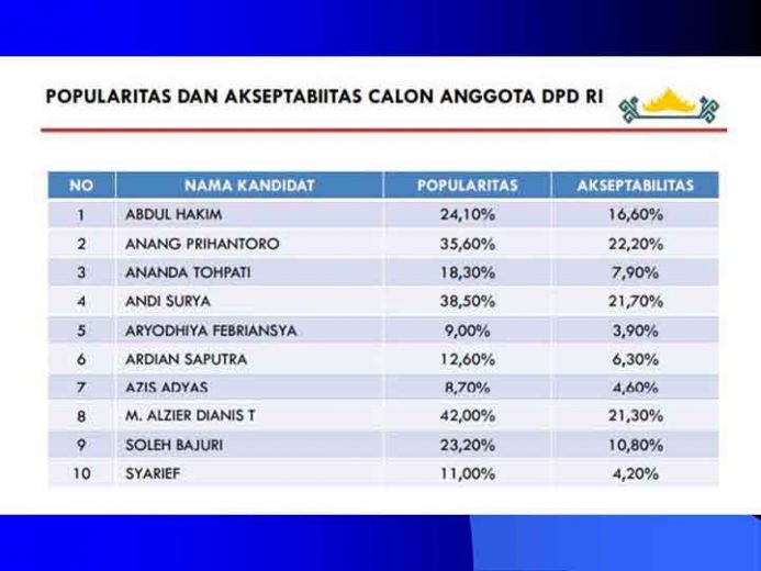TERASLAMPUNG.COM — Hasil survei Rakata Institute tentang popularitas dan elektabilitas calon anggota Dewan Perwakilan Daerah Republik Indonesia (DPD) RI pada Pemilu 2018 mendatang dari daerah pemilihan Lampung menunjukkan fakta lumayan mengejutkan. Yakni, dua petahana bertengger pada posisi atas disusul Alzier Dianis Thabrani.
