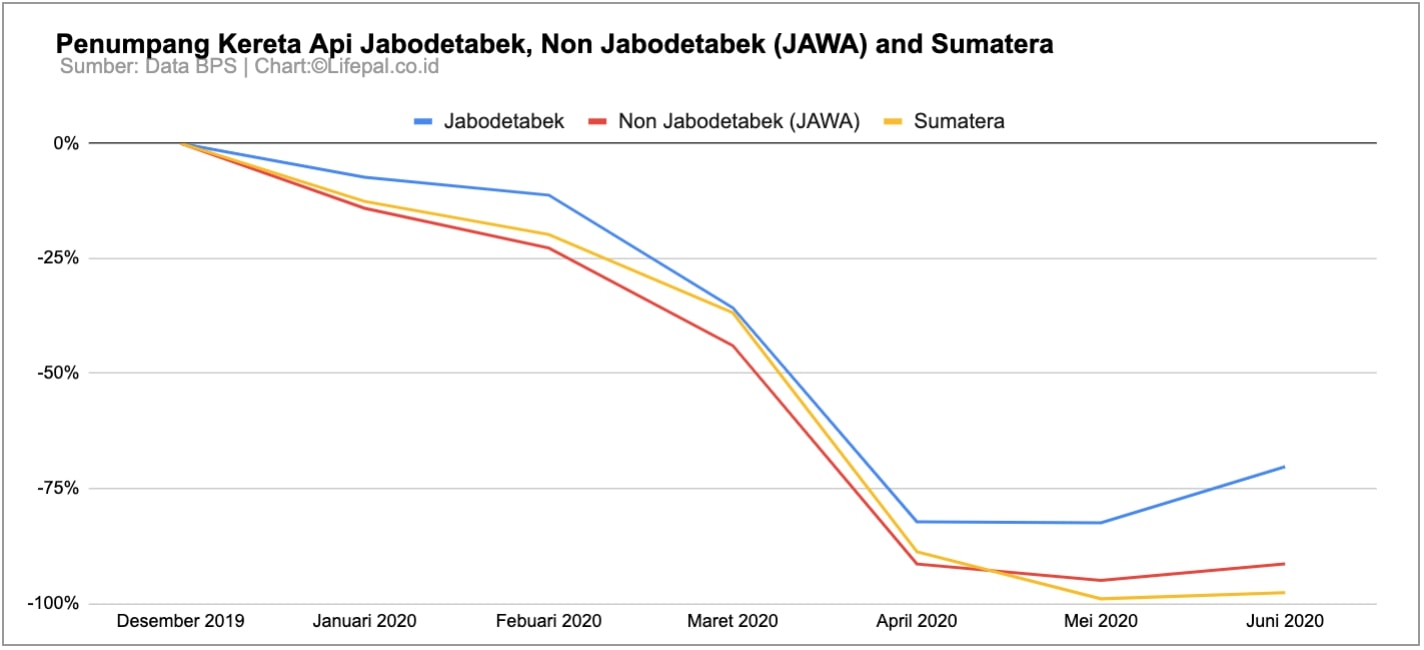 Grafik di atas juga memperlihatkan penurunan yang cukup tajam pada jumlah penumpang kereta api di Jabodetabek, Non Jabodetabek (JAWA), dan Sumatera. Puncak pelemahan terjadi pada bulan Mei 2020, di mana tercatat pelemahan dengan persentase rata rata di kisaran -92% jika dibandingkan dengan Desember 2019.