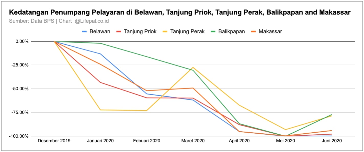 Berdasarkan grafik di atas terlihat terjadi penurunan yang cukup tajam pada angka kedatangan penumpang pelayaran di beberapa pelabuhan utama di Indonesia yaitu Pelabuhan Belawan, Tanjung Priok, Tanjung Perak, Balikpapan, dan Makassar.
