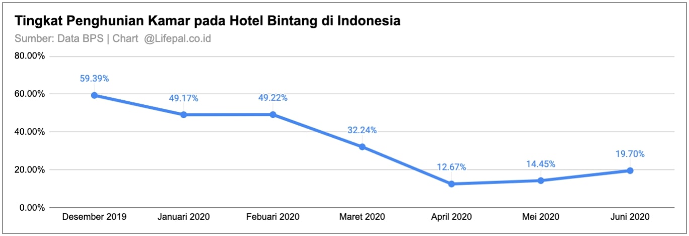 Tingkat Penghunian Kamar (TPK) hotel klasifikasi bintang di Indonesia pada Juni 2020 mencapai rata-rata 19,70% atau sudah turun 39,69 poin sejak Desember 2019.