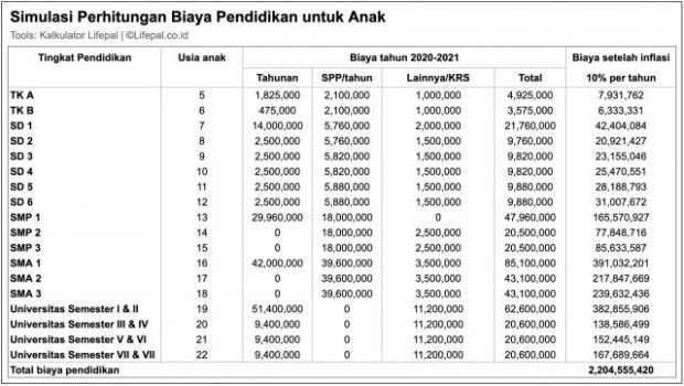 Tabel di atas menunjukkan perhitungan biaya pendidikan dengan asumsi inflasi sebesar 10% per tahun. Jika dijumlahkan, maka total biaya yang harus dikumpulkan seseorang untuk biaya pendidikan anak dalam 22 tahun mencapai Rp 2,2 miliar.