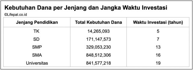 Tabel di bagian kanan menunjukkan jangka waktu investasi yang harus Anda lakukan untuk memenuhi kebutuhan biaya tersebut. Pilihlah investasi yang sesuai dengan profil risiko Anda dan jangka waktu investasinya.