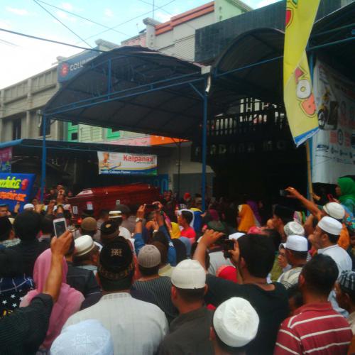 Jenazah Iptu M. Syahir Perdana dibawa dari rumah duka menuju pemakaman tanah wakaf Ar Raudah Jalan Besitang Simpang Tangsi Pangkalan Brandan, Minggu (7/2) sore. (Foto: hariansinarindonesiabaru) |