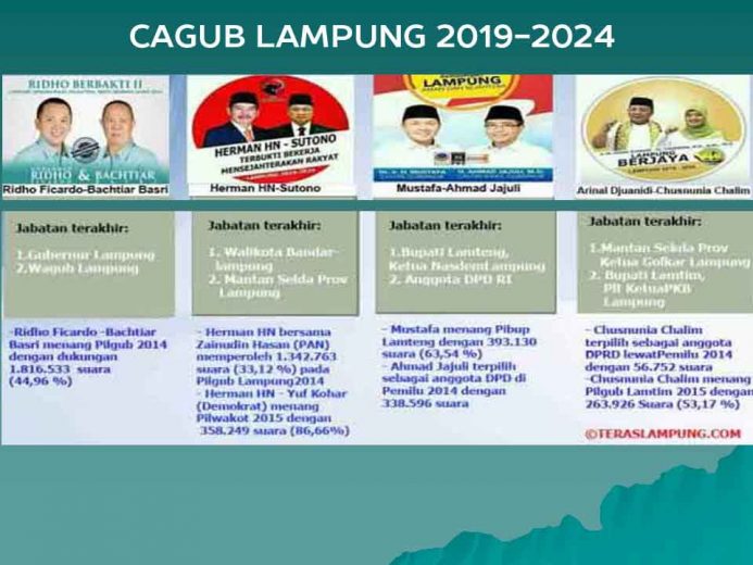 TERASLAMPUNG.COM — Pemilihan Gubernur Lampung 2018 akan digelar pada 27 Juni 2018. Pada minggu kedua Januari 2018, tahap pendaftaran sudah dimulai oleh KPU sudah dimulai. Tercatat ada empat pasangan bakal calon Gubernur Lampung-calon Wakil Gubernur Lampung 2019-2024.