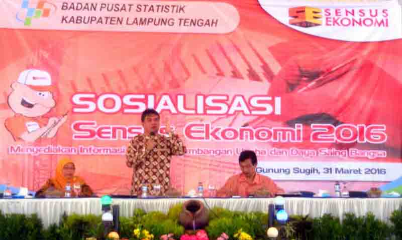 Sosialisasi sensus ekonomi dibuka oleh Bupati Lampung Tengah Mustafa serta Direktur Statistik Distribusi BPS RI Dr. Anggoro yang juga menjadi narasumber dan dimoderatori langsung oleh Kepala BPS Lampung Yeane Irmaningrum.