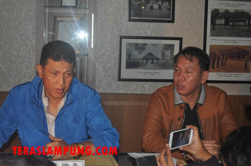 | Kapolda Lampung Brigjen Edward Syah Pernong (jaket biru) saat memberikan keterangan kepada para jurnalis di Mapolda Lampung, Minggu malam (30/8/2015). |
