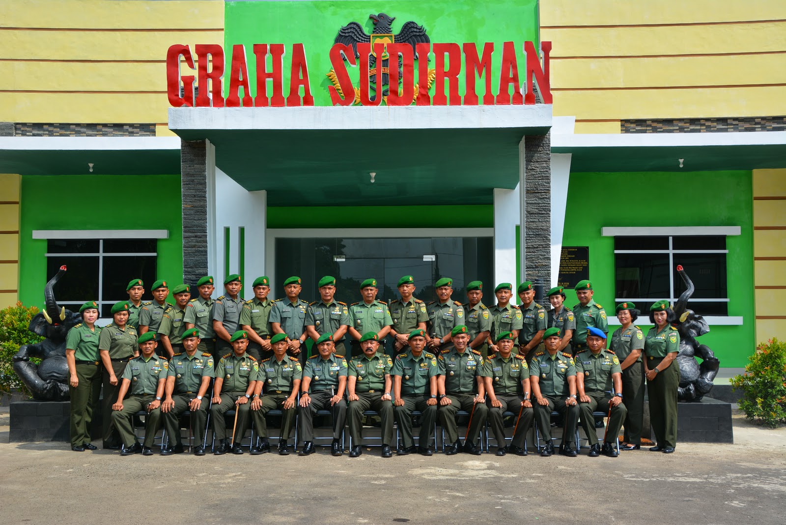 | Kasdam II/Sriwijaya Brigjen TNI Komaruddin Simanjuntak bersama Danrem 043/Gatam Kolonel Arm Drs Winarto, M,Hum foto bersama dengan prajurit dan PNS di Makorem 043 /Gatam , Jumat (8/5). |