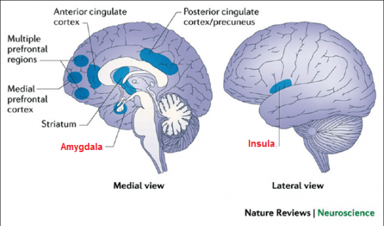 Seperti yang dapat dilihat pada gambar diatas, Amygdala adalah bagian otak yang berada di bagian tengah depan. Penelitian-penelitan dengan menggunakan MRI Scan menunjukan jika bagian ini aktif ketika kita merasa takut. Sementara, insula yang terletak di bagian belakang dan samping diketahui berhubungan dengan rasa empati.
