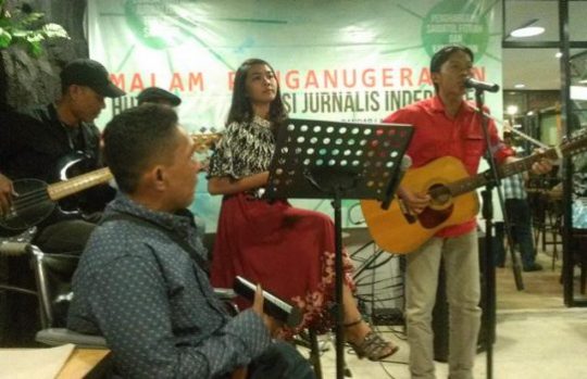 BANDARLAMPUNG-Musisi perdamaian dunia, Kim Commanders bersama musisi jalanan yang tergabung dalam Komunitas seniman jalanan lampung (Kosela), tampil memukau malam puncak perayaan HUT ke-24 Aliansi Jurnalis Independen (AJI) serta penyerahan penghargaan Saidatul Fitriah dan Kamaroeddin Award 2018 yang dihelat di Cafe Clary’s Hotel Andalas di Jalan Radin Inten, Enggal, Bandarlampung, Minggu 9 September 2018 malam.