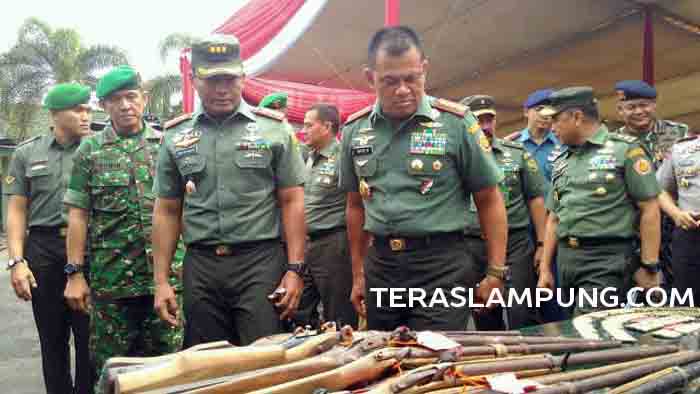 Usai memberikan pengarahan, Panglima TNI Jenderal Gatot Nurmantyo di dampingi Danrem 043 Gatam Kolonel Inf Joko Putranto, beerkesempatan untuk melihat puluhan pucuk senjata api rakitan jenis laras pendek dan panjang, ratusan butir amunisi dan bom hasil sitaan dan penyerahan dari masyarakat kepada Korem 043 Gatam dan Jajarannya di Lapangan Makorem 043 Gatam.