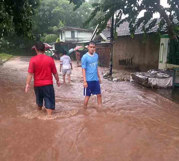 Di akun Facebooknya Eko menunjukkan beberapa foto yang menggambarkan air berwana cokelat mengalir deras. Limpahan air itu juga menggenangi halaman rumah dan sudah nyaris menyentuh teras.