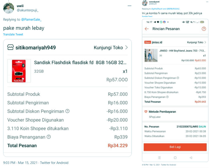 Dalam kumpulan tangkapan gambar di atas, tampak pengguna yang berhasil membeli USB Sandisk 8GB dari harga Rp57,000 menjadi Rp34,229 saja setelah mendapatkan diskon dan voucher Murah Lebay. Ada pula pengguna yang membeli jeans dari Jiniso.id dengan harga awal Rp130,000, didiskon menjadi Rp65,000 dan dengan tambahan potongan voucher Murah Lebay, voucher toko, dan Koin Shopee menjadi hanya Rp39,643. Jadi, terbukti kan, betapa menguntungkannya promo terbaru Shopee ini?