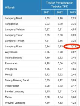 Kotabumi–Selama lebih dari satu dekade, Kabupaten Lampung Utara ternyata tak pernah bisa ke luar dari tiga besar di seantero Lampung dalam urusan tingkat pengangguran. Menurut data Badan Pusat Statistik Lampung Utara, tingkat pengangguran terbuka di sana menempati posisi dua besar di Lampung pada tahun 2023 lalu.