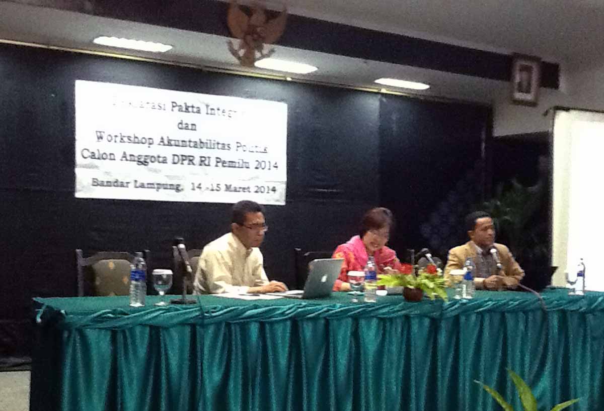 Bandarlampung—Forum Masyarakat Peduli Parlemen Indonesia (Formappi) menggelar acara Penandatangaanan Pakta Intregritas bagi calon anggota DPR RI, DPRD Provinsi Lampung, dan DPRD Kabupaten/Kota di Hotel Sahid, Bandarlampung malam ini (14/3). Acara yang dihadiri oleh belasan caleg itu diisi dialog dengan pembicara Dr. Siti Juhro (peneliti LIPI) dan Ibrahim Z. Fami Badoh (Direktur Program Transparansi International Indonesia). Hadir juga aktivis NGO dan beberapa akademisi.