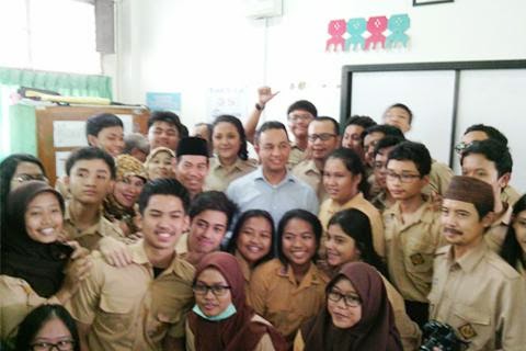 | Mendikbud Anies Baswedan berfoto bersama para siswa dan guru usai pertemuan di SMAN 87 Jakarta, Rabu (12/11). (Foto: IST/Kemendikbud) |