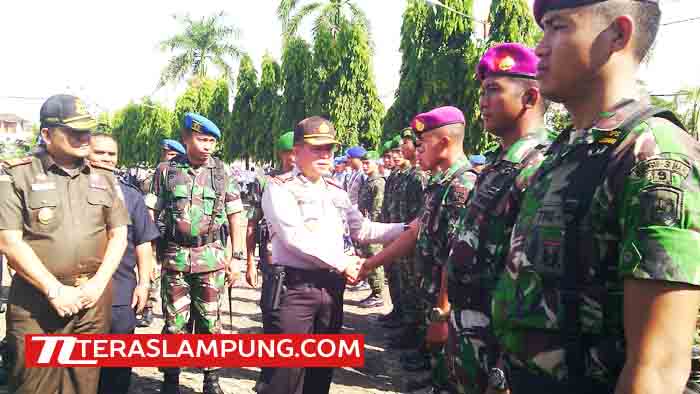| Wakapolda Lampung Kombes Bonifasius Tampoy menyalami personel TNI yang akan membantu tugas aparat Kepolisian mengamankan Natal dan Tahun Baru di Lampung. |