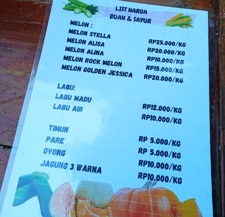 Cukup dengan membeli tiket masuk seharga Rp 10.000/orang, pengunjung sudah bisa menikmati kebun yang terhampar buah melon dan buah labu yang bergantungan diatas kepala.