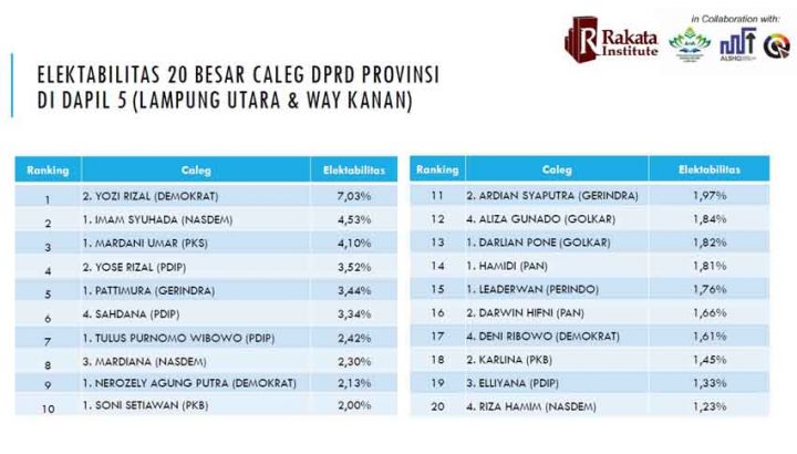 Dengan elektabilitas seperti tabel di atas, jika dihitung dengan metode Sainte Lague, maka para caleg DPRD Lampung di dapil Lampung 5 (Lampung Utara dan Way Kanan) yang diprediksi berpeluang lolos adalah:
