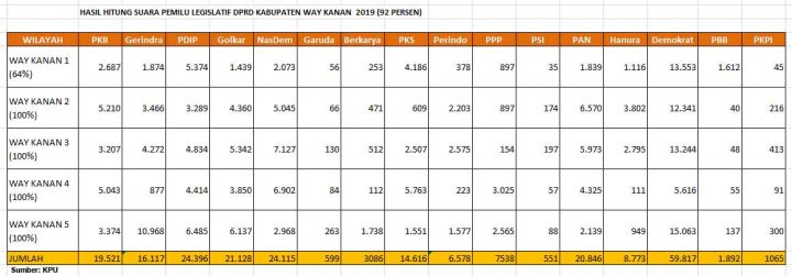 TERASLAMPUNG.COM — Penghitungan suara berdasarkan form C1 (real count) untuk Pemilu Legislatif 2019 di Kabupaten Waykanan pada Rabu siang (1 Mei 2019) sudah mencapai 92,09 persen. Berdasarkan rekapitulasi suara yang sudah hampir selesai itu, Pa...