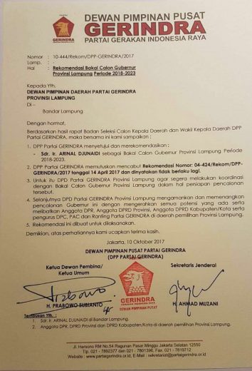 Surat yang tujukan kepada DPD Partai Gerindra Lampung dan ditembuskan kepada Arinal Djunaidi, Anggota DPR, DPRD Provinsi dan DPRD Kabupaten/Kota itu sekaligus mencabut rekomendasi nomor 04-424/Rekom/DPP-GERINDRA/2017 tanggal 14 April 2017 dan dinyatakan tidak berlaku.
