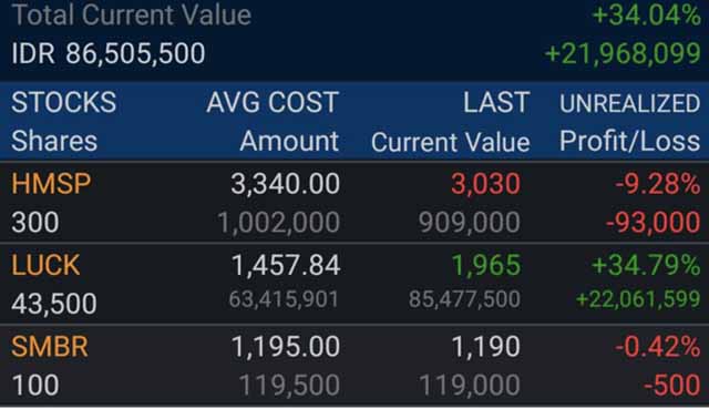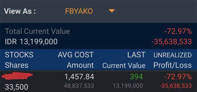 Hal ini sayangnya tidak tercermin dengan baik dalam kasus ini, karena kerugian dibiarkan berlanjut hingga -72%, bahkan mungkin lebih jika dibandingkan dengan saldo awal investasi.