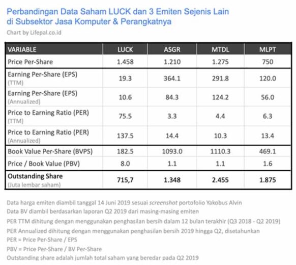 Dengan pendapatan bersih sebesar 5.3 miliar, LUCK di harga Rp1.458 memiliki PER sebesar 137.5 kali dari pendapatan per-lembar sahamnya. Sementara itu, tiga emiten pada industri yang sejenis hanya memiliki PER belasan saja, walaupun telah memiliki pangsa pasar yang lebih besar.