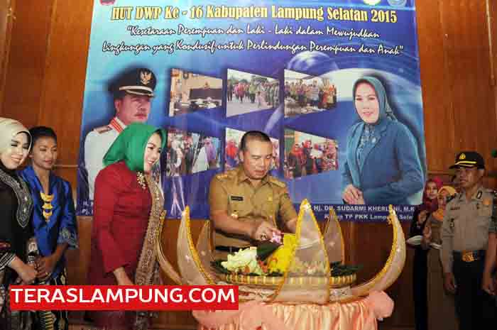 Iwan J Sastra/Teraslampung.com Pj Bupati Lampung Selatan Kherlani didampingi Ketua Tim Penggerak PKK Sudarmi memotong nasi tumpeng pada puncak Peringatan Hari Ibu ke-87 dan HUT Dharwa Wanita Persatuan ke-16 tahun 2015, di GSG Ka...