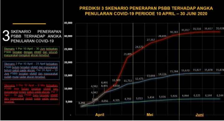 “Jika skenario ke 1 dapat berjalan dengan baik maka pada akhir April seharusnya korban virus Covid-19 hanya di kisaran angka 4.700, akhir Maret 5.900, dan akhir Juni 6.100, kemudian angkanya turun dan masa wabah Covid-19 selesai di Indonesia”, tambahnya.
