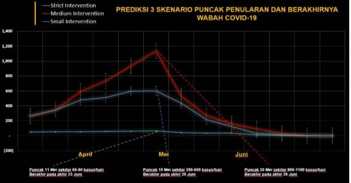 “Wabah Covid-19 di Indonesia akan mengalami puncaknya pada tanggal 11 – 20 Mei dan kemudian semakin menurun serta berakhir jumlah penyebaran kasus per hari pada tanggal 23 – 30 Juni. Pada skenario ke 1 dijelaskan bahwa puncak penyebaran terjadi pada tanggal 11 Mei dengan kisaran kasus 60-80 kasus/hari dan berakhir pada tanggal