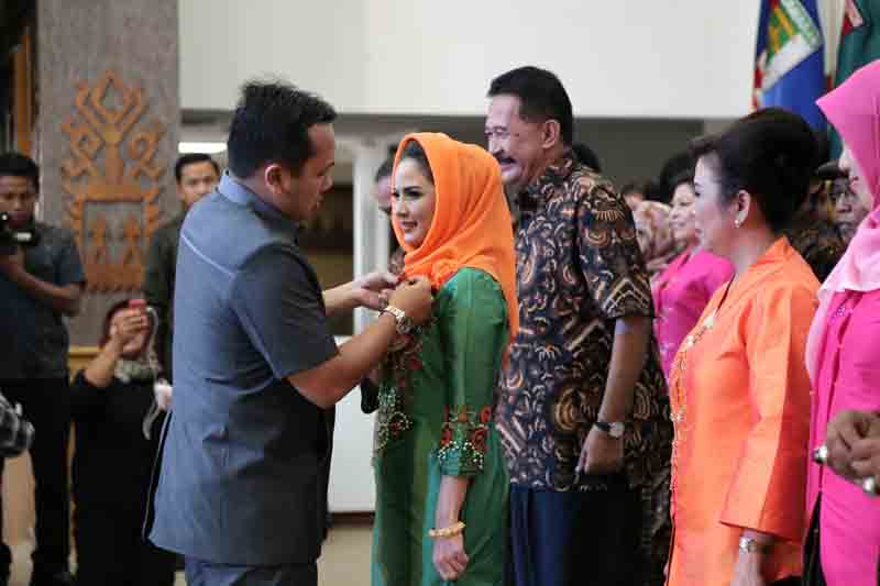 | Gubernur Ridho Ficardo menyematkan pin DKL untuk Ny. Aprilani Yustin (Foto: Deka/Ist) |