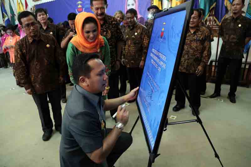 “Provinsi Lampung membangun industri dan promosi wisata. Jangan wisatawan bicara bentang alam Lampung yang indah saja, kalau bisa wisawatan juga melihat kesenian Lampung.Tugas berat menanti anda para pengurus untuk memajukan seni tradisional maupun kontemporer,” Gubernur menambahkan.