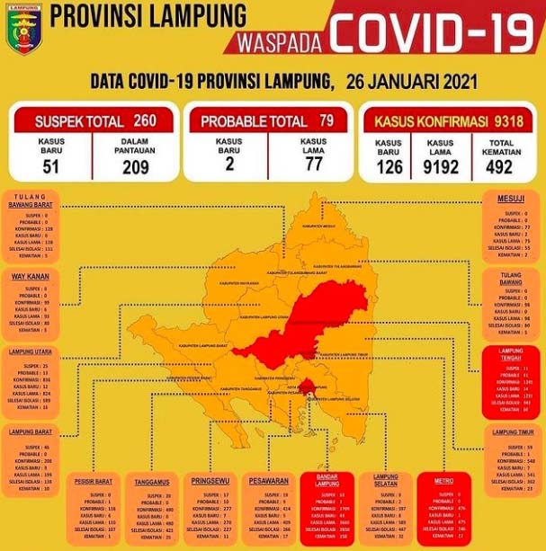 TERASLAMPUNG.COM — Hingga Rabu (27/1/2021) penyebaran virus corona atau Covid-19 di Lampung masih belum terkendali. Penambahan kasus baru dalam jumlah besar (per hari di atas 100 kasus) terjadi sudah satu bulan lebih. Pada hari ini saja ada penambahan kasus baru sebanyak 145 sehingga total kasus positif Covid-19 di Lampung menjadi 9.466.