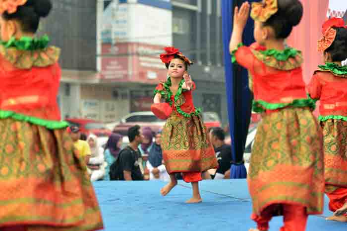| Para penari anak-anak dalam pentas tari peringatan Hari Tari Sedunua di Bundaran Adipura Bandarlampung, Jumat sore (Foto: Yopie Pangkey) |