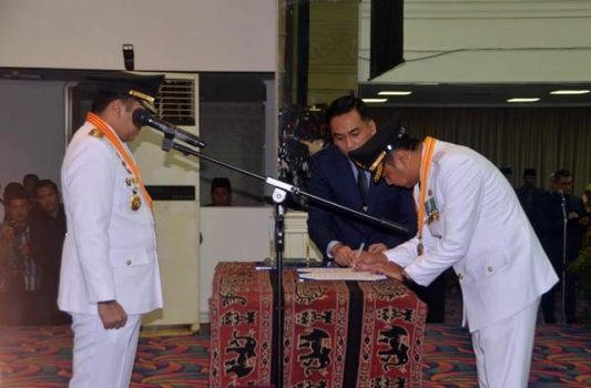 Agung Ilmu Mangkunegara dan Budi Utomo resmi menjabat Bupati dan Wakil Bupati Lampung Utara 2019-2024, usai dilantik oleh Gubernur Lampung Muhammad Ridho Ficardo di Gedung Balai Keratun Lantai III Kantor Gubernur Lampung, Senin (25/3) pagi.