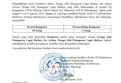 Seprita mengatakan pihaknya sudah menerima surat pengumuman dari LSP P2 Kebudayaan yang menyatakan Isbani Saputra dinyatakan kompeten sebagai asisten ahli pemugaran.