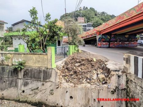 Berdasarkan pemantauan teraslampung.com, selain tanah yang menumpuk di depan pagar rumah Irfansyah juga pondasi di kali Kota Baru ada setinggi satu meter dan panjang dua meter lebih belum diperbaiki.