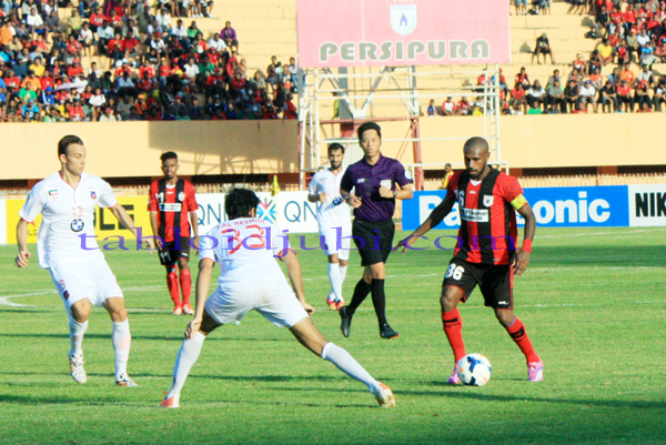 Dipenghujung babak pertama Persipura kian menjauh 3-0 lewat gol kedua Robertino Pugliara. memanfaatkan umpan Titus Bonai.