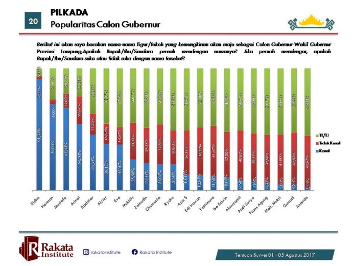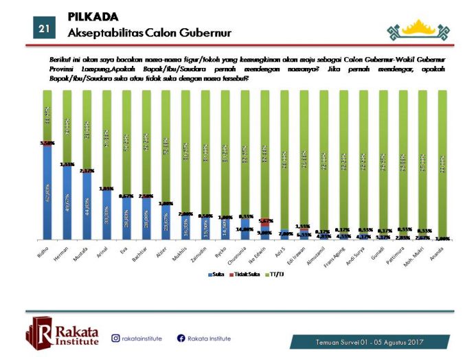 Itulah hasil survei terakhir yang dirilis Rakata Institute di Hotel Horison, Bandarlampung, Selasa malam (8/8/2017).