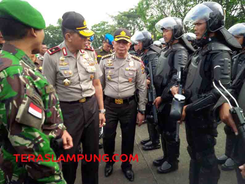 | Kapolda Lampung Brigjen Edward Syah Pernong mengecek kesiapan pasukan pada Gelar Operasi Mantap Praja Krakatau 2015 di Lapangan Saburai, Bandarlampung, Rabu (26/8/2015). |
