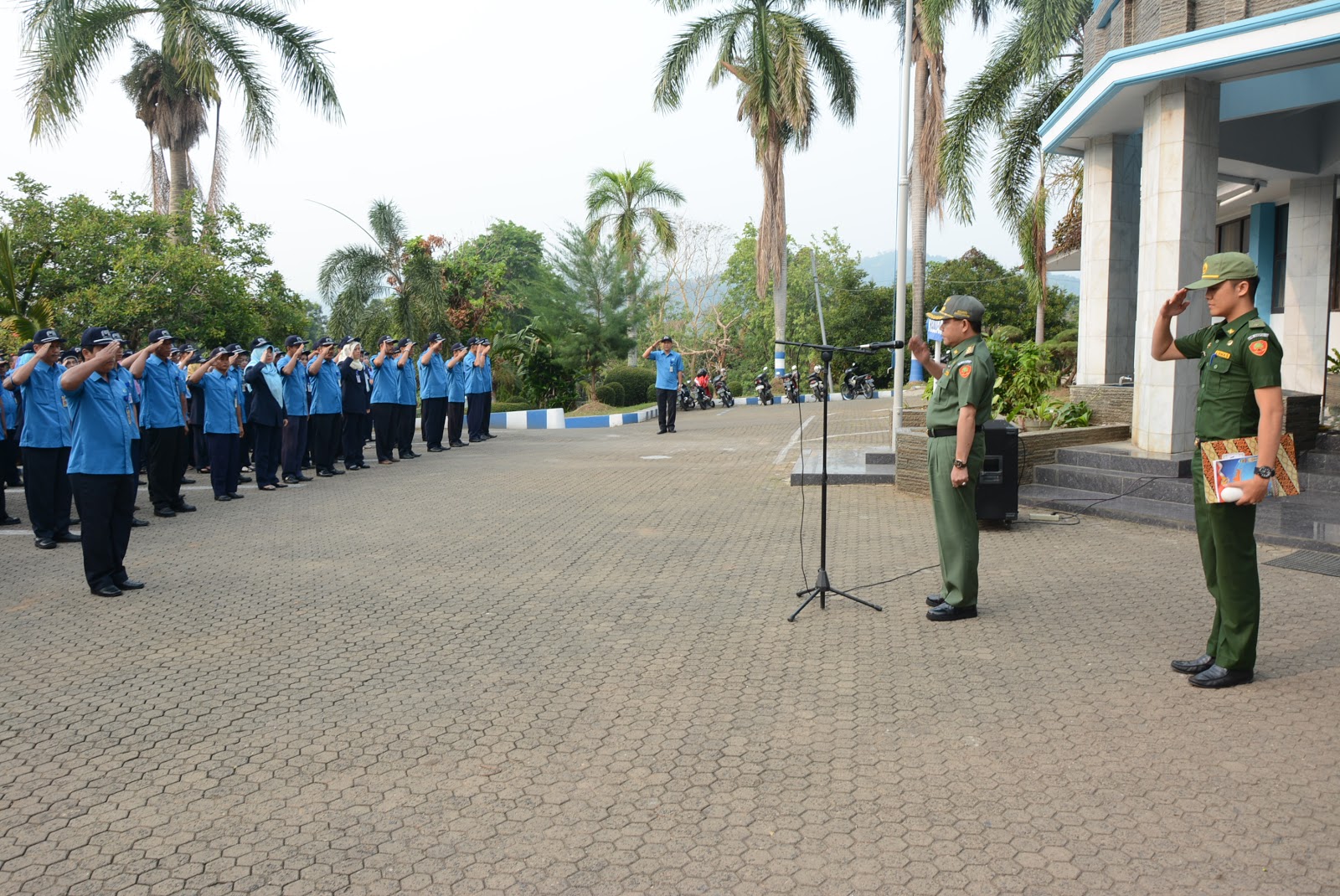 | Pj. Walikota Sulpakar saat menjadi pemimpin upacara dalam apel mingguan di lingkungan PDAM Kota Bandar Lampung, Senin (26/10). |
