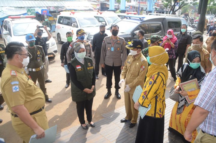 Wagub Lampung didampingi Kabid Humas Polda Lampung Kombes Pandra, Plt. Bupati Lampung Utara Budi Utomo, dan rombongan meninjau Pasar Central Kotabumi, Rumah Sakit Umum Ryacudu, dan Posko Terpadu Covid-19 di Gedung Korpri, sekaligus membagikan masker kepada masyarakat.