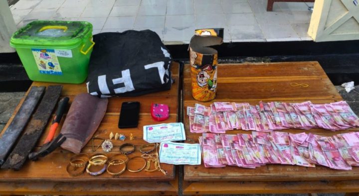 Dari penangkapan tersangka, kata Iptu Suhardi, petugas menyita barang bukti berupa uang tunai Rp 31 juta, kalung emas 24 karat seberat 50 gram, surat pembelian perhiasan, perhiasan imitasi lainnya, kaleng tabungan, kotak Tupperware, dua batang pegas (per) mobil, palu dan kain spanduk bekas.