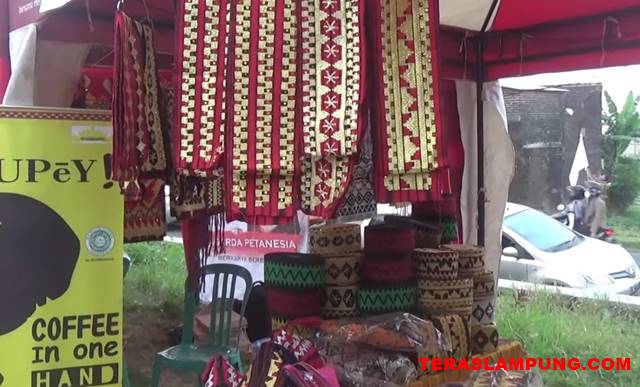 Salah satu stan di bazar pasar rakyat DPW Petanesia Lampung, memamerkan kerajinan lokal khas lampung seperti peci, selendang (sal) dan tas bercorak tapis, dan aneka produk berbahan kain tapis dan lainnya.