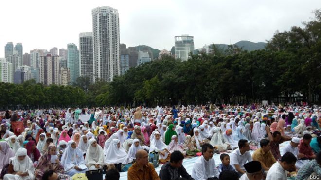 | Puluhan ribu WNI Shalat Ied di Victoria Park, Hong Kong, Sabtu (18/7/2015). Foto BBC |