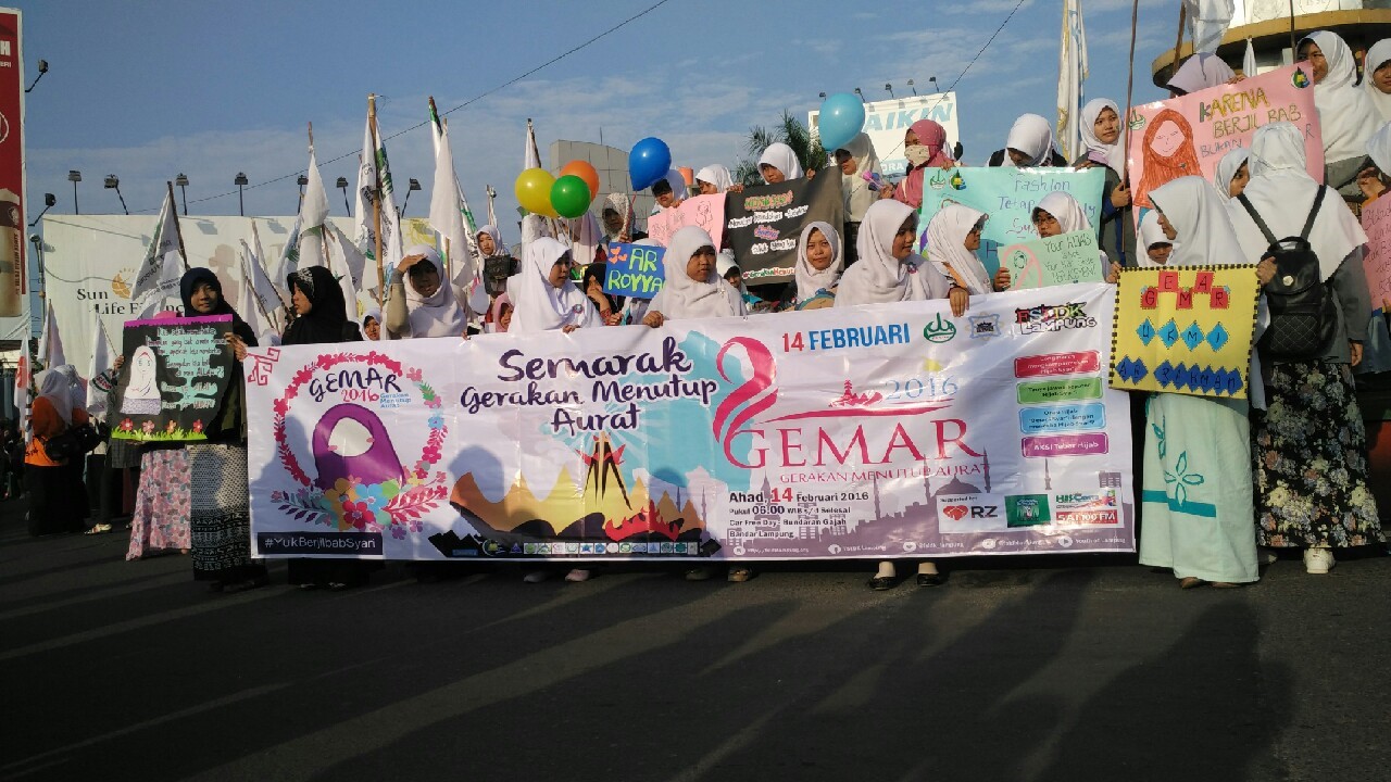 BANDARLAMPUNG, Teraslampung.com — Ratusan mahasiswa dan remaja yang berasal dari berbagai lembaga dan komunitas islam di Lampung menggelar aksi Gerakan Menutup Aurat (GEMAR) Lampung 2016. Aksi damai dilakukan di Kawasan Car Free Day, Bundaran Gajah Kota Bandarlampung, Minggu (14/2/2016) pagi.