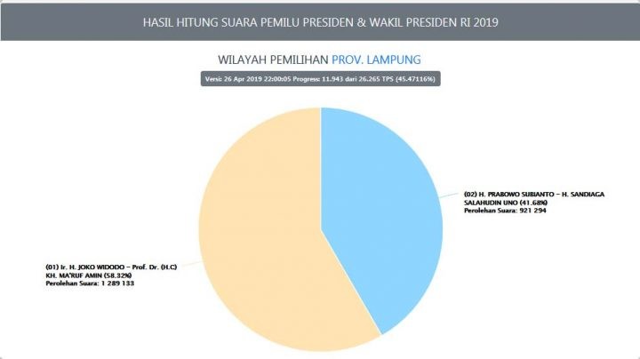 Real Count KPU Malam Ini: di Lampung Jokowi Maruf 58,32%, Prabowo-Sandi 41,68%